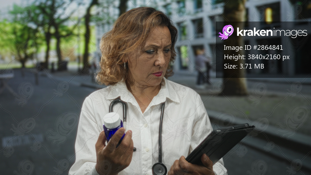 Middle aged woman doctor with stethoscope checking pill bottle and viewing tablet on street; concern.