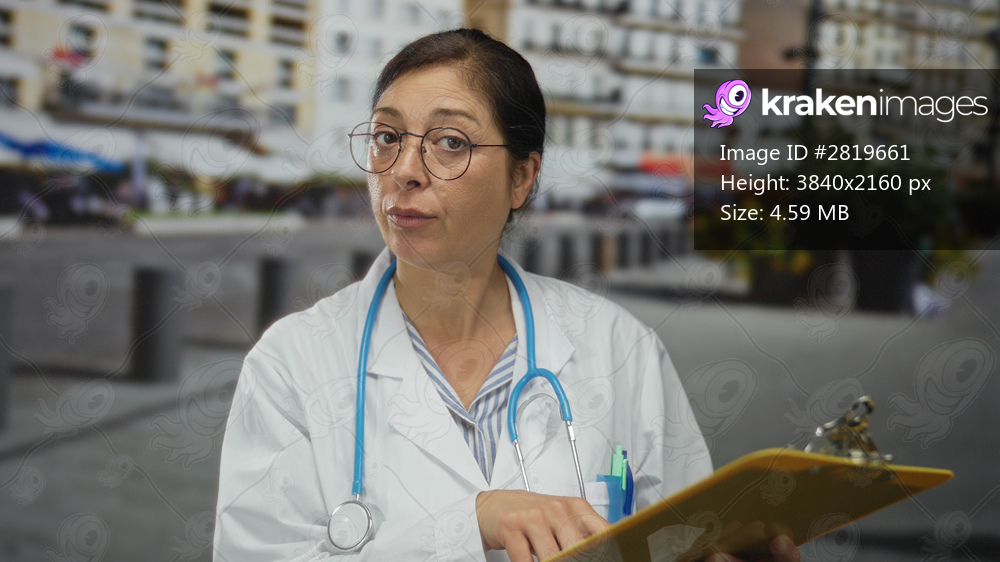 Middle aged woman doctor with stethoscope reads patient notes on clipboard on city street; professionalism.