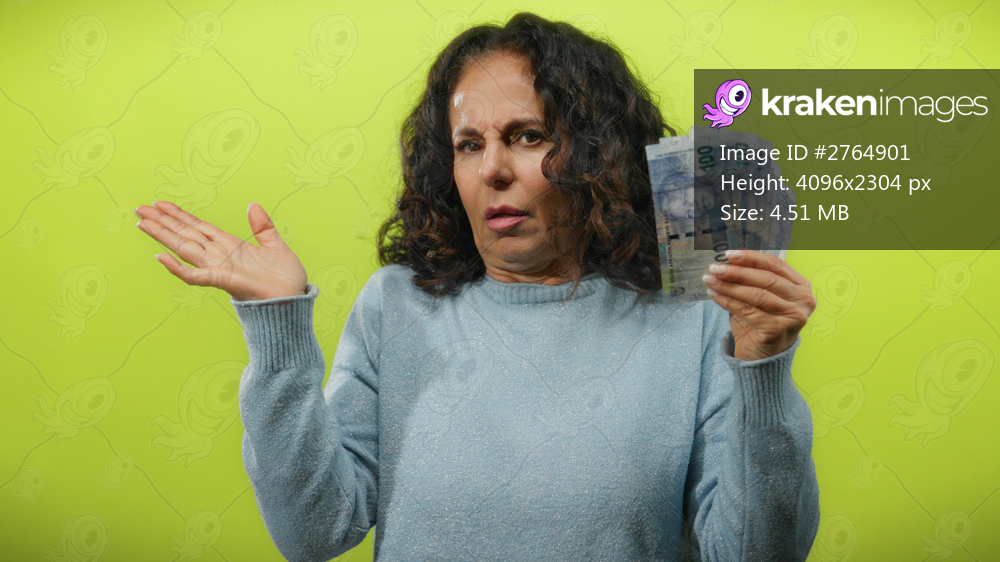 Middle-aged woman, expressions of concern holding south african banknotes against a bright yellow backdrop suggest financial decisions or abundance.