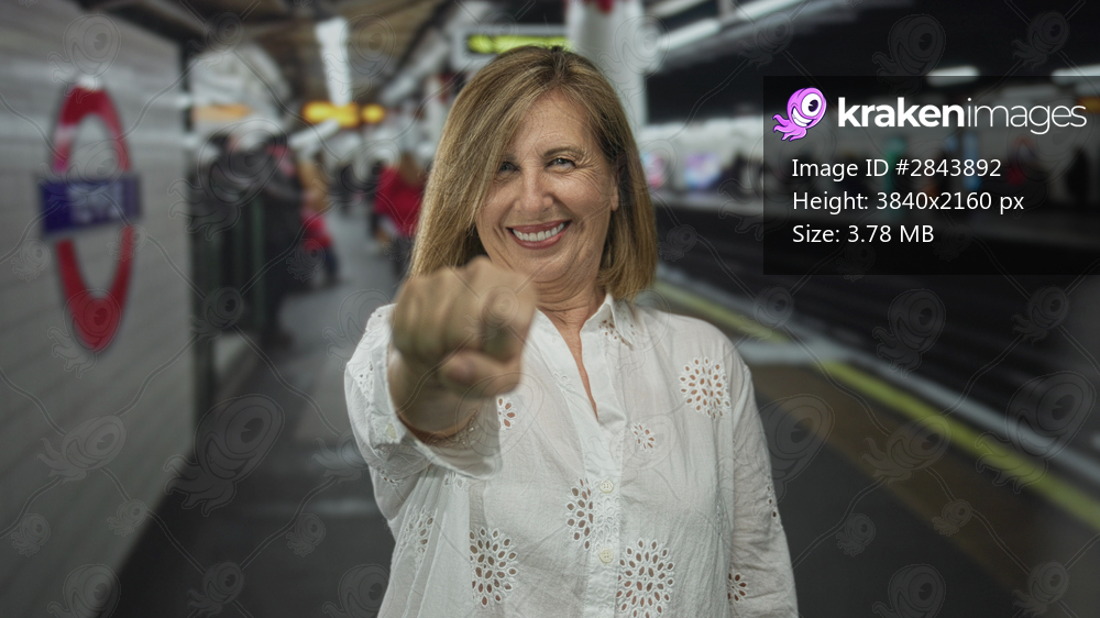 Middle aged woman extends bare fist while smiling at crowded train station platform during rush hour; confidence strength empowerment resilience.