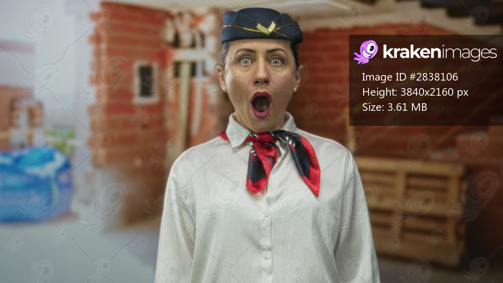 Middle aged woman flight attendant wearing navy hat and red scarf with mouth open inside brick building interior; surprise.