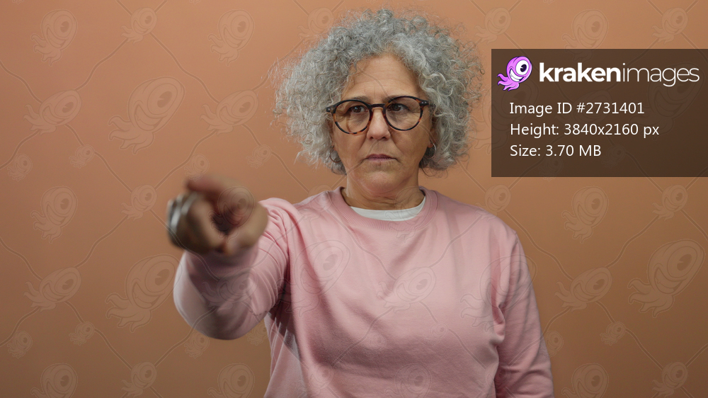 Middle-aged woman with glasses and curly grey hair pointing with focus, wearing a pink sweater against a warm brown background, isolated indoors.