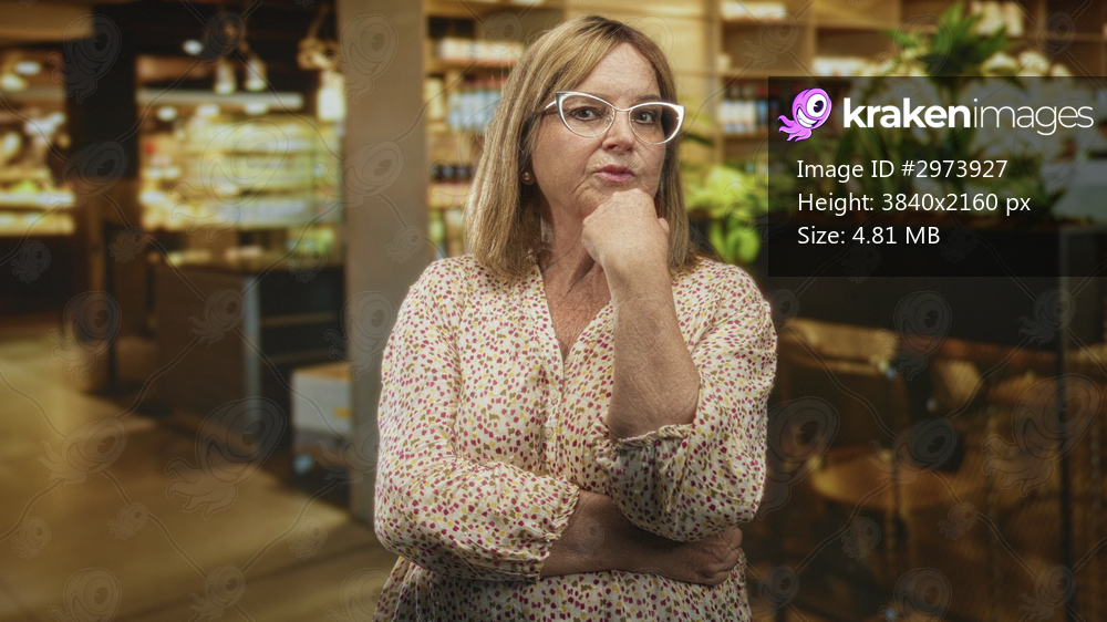 Middle aged woman with glasses holds hand to chin, arms crossed, standing near shelves and plants in a market building; thoughtful reflection.