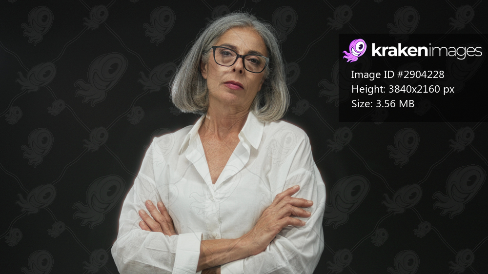 Middle-aged woman with gray hair and glasses, arms crossed wearing a white shirt in studio against a black backdrop; defiance resilience.