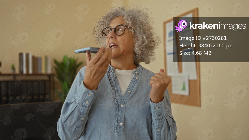 Middle-aged woman with grey hair and glasses in office speaking on phone surrounded by indoor décor and bulletin board suggesting workplace setting and communication focus.
