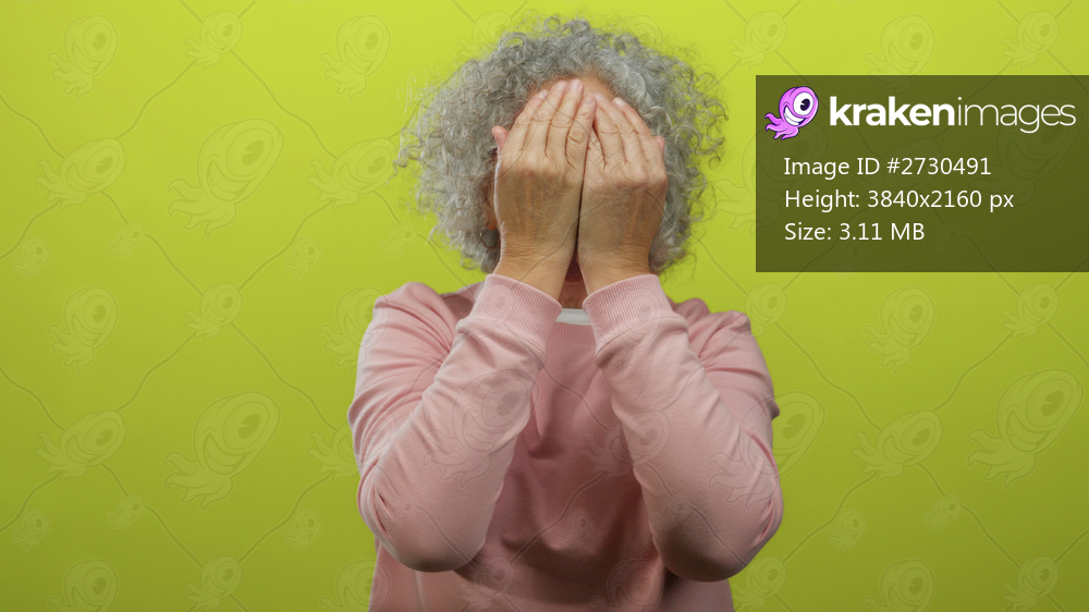 Middle aged woman with grey hair in pink sweater playfully removes hands from face smiling in front of bright yellow background wall.