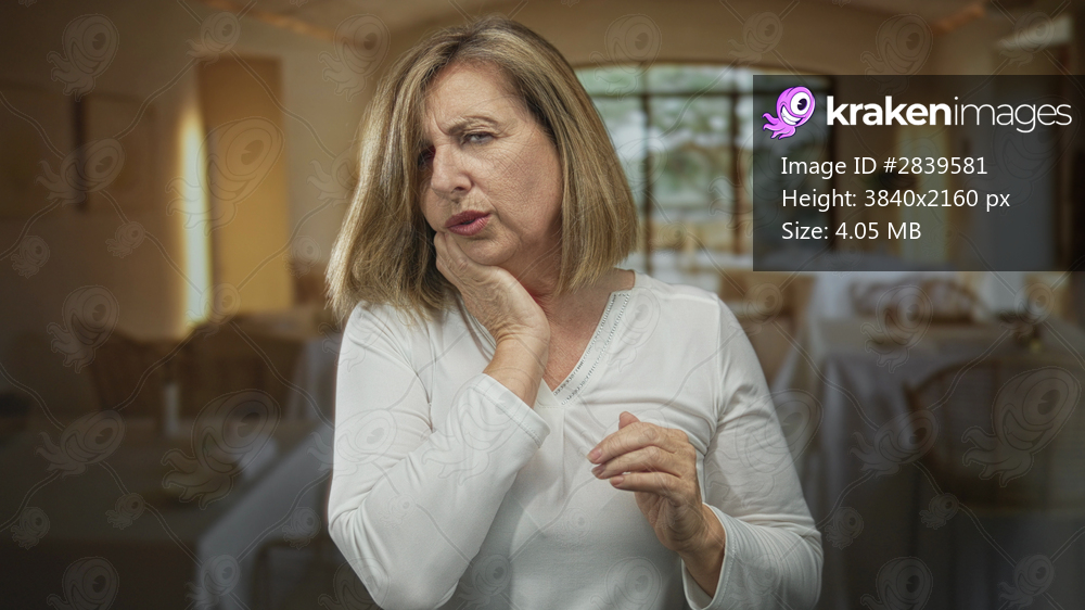Middle aged woman grimacing and holding cheek with hand in a building near empty tables and chairs; discomfort.