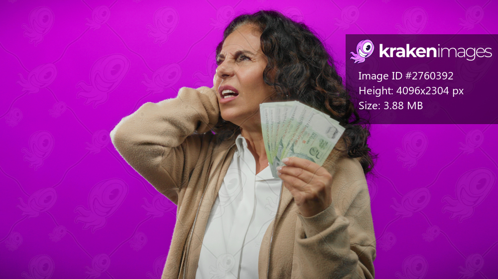Middle-aged woman gripping her ear while holding singapore dollar banknotes against a purple background, implying noise-induced discomfort with finances. - Kraken Images
