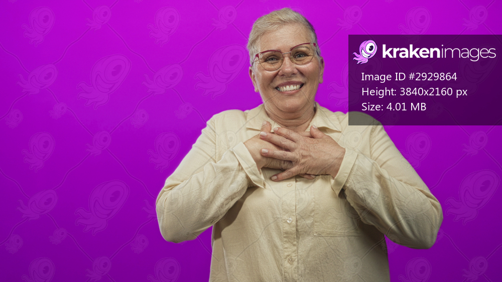 Middle aged woman with hands over heart smiling and reaching forward in magenta studio; tender warmth gratitude connection.