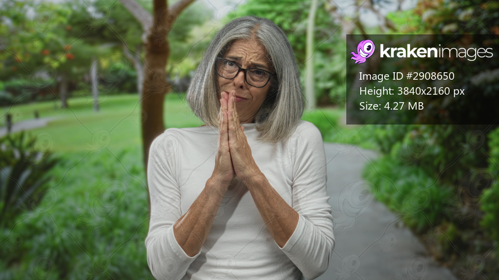 Middle aged woman with hands pressed together in forest path, praying gesture, gray hair and glasses, wearing white long sleeve top; pleading apology.