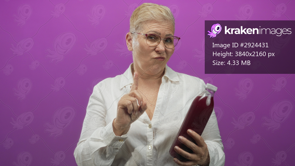 Middle aged woman holding a dark juice bottle and pointing finger in a purple studio; skepticism caution.