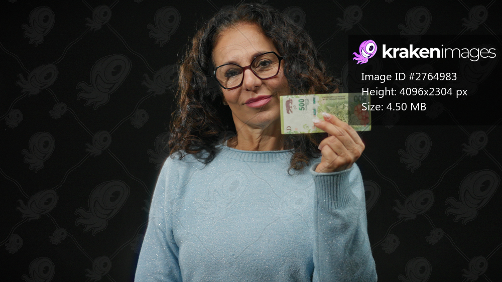 Middle-aged woman holding argentine banknotes against a black background, showcasing currency prominently in a studio-like setting.