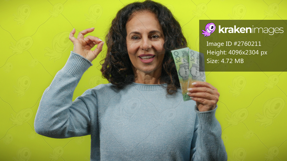 Middle-aged woman holding australian dollars meditates confidently against a vibrant yellow wall, embodying calm financial success and mindfulness.