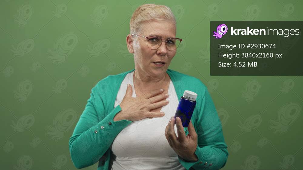 Middle aged woman holding blue medicine bottle with hand on chest in studio against green backdrop; health concern.