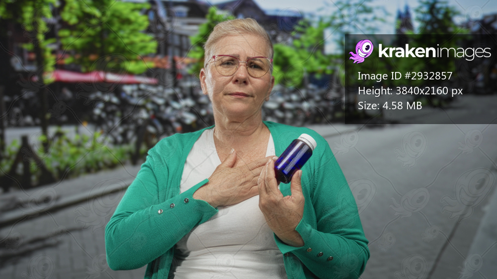 Middle aged woman holding blue medicine bottle with hand on chest near parked bicycles on city street; health concern.