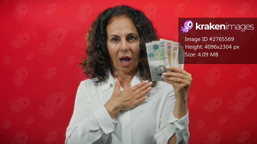Middle-aged woman holding british pounds with surprised expression against a red background, highlighting currency and emotion.