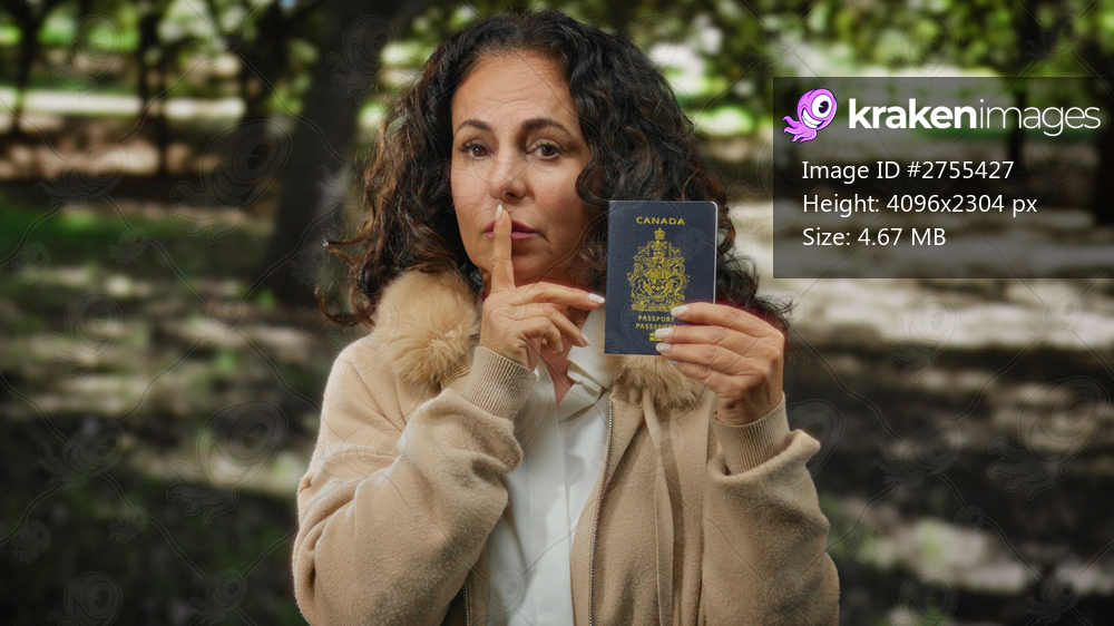 Middle-aged woman holding canadian passport while gesturing silence in a park setting, wearing a beige coat in an outdoor environment with trees in the background. - Kraken Images