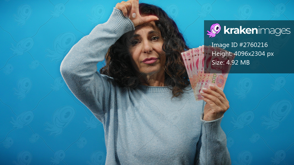 Middle-aged woman holding chinese yuan banknotes against blue background, expressing loser sign humorously with isolated wall context, capturing cultural and financial themes. - Kraken Images