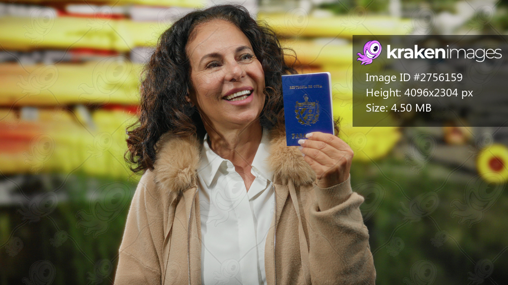 Middle-aged woman holding cuban passport outside near kayak rental by seaside showing excitement for travel.