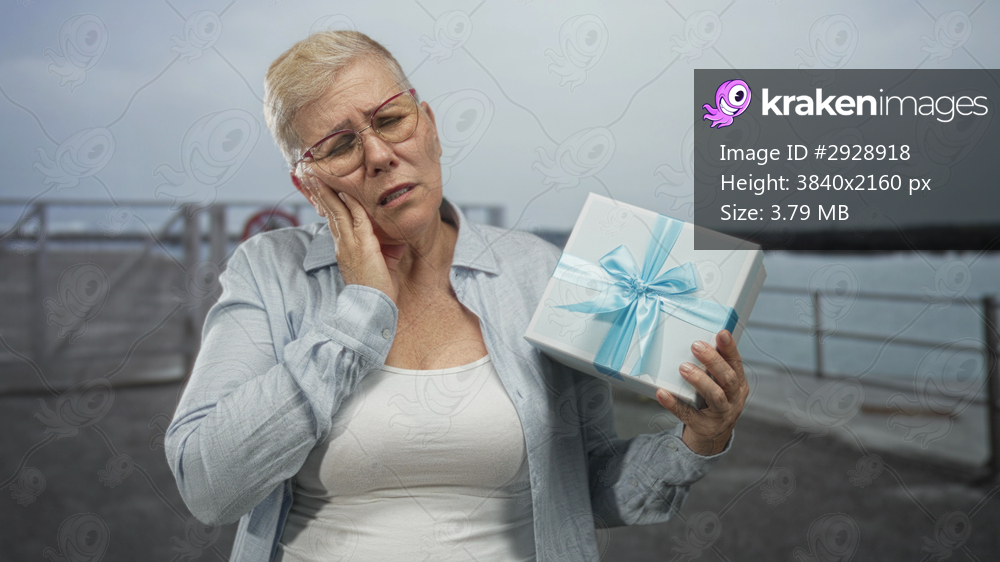 Middle aged woman holding gift box with hand on cheek for toothache on street pier by water, wearing glasses and tank top; disappointment sadness loneliness. - Kraken Images
