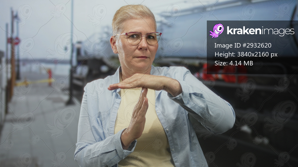 Middle aged woman holding hands in time out gesture on street platform beside tanker truck and metal railing; firm determination.