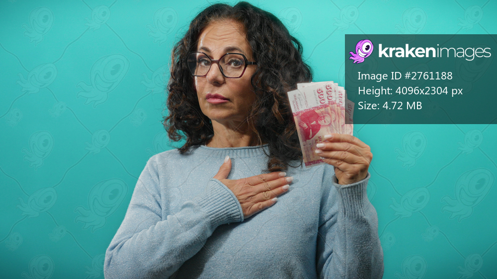 Middle-aged woman holding icelandic krona banknotes while raising hand in oath gesture against a blue wall background.