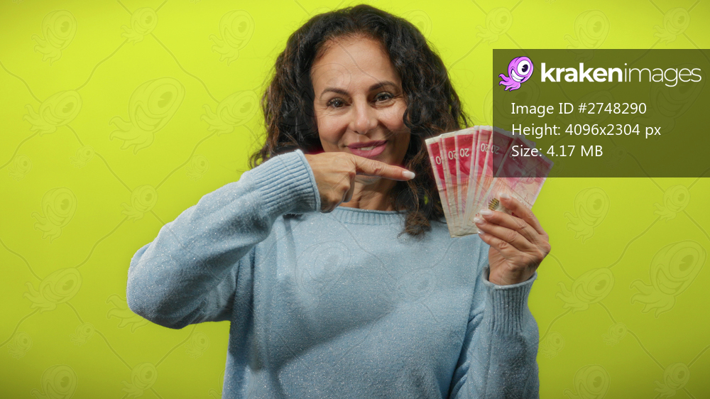 Middle-aged woman holding israeli shekels making an ok gesture against a yellow background, symbolizing money and success in a vibrant setting.