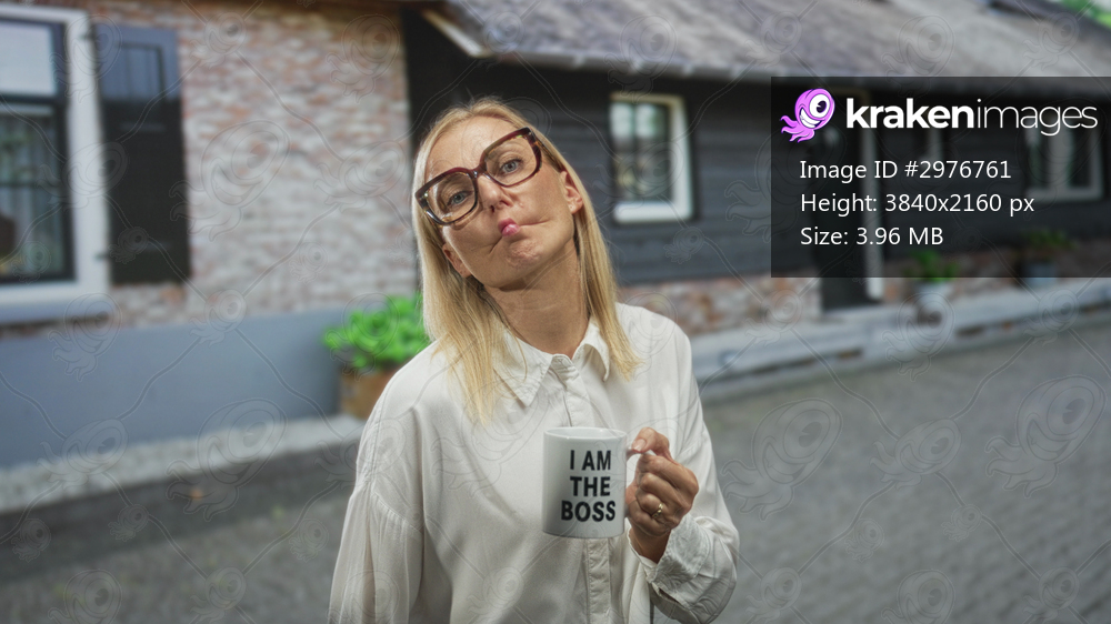 Middle aged woman holding mug reading i am the boss, smiling with closed eyes on a residential street; confidence leadership.