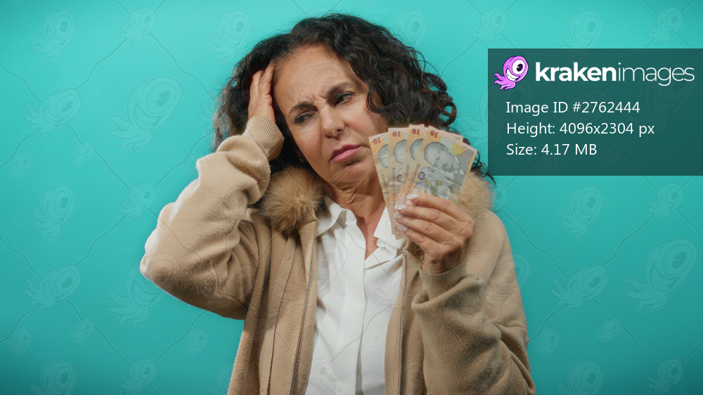 Middle-aged woman holding romanian banknotes with a worried expression against a blue background.