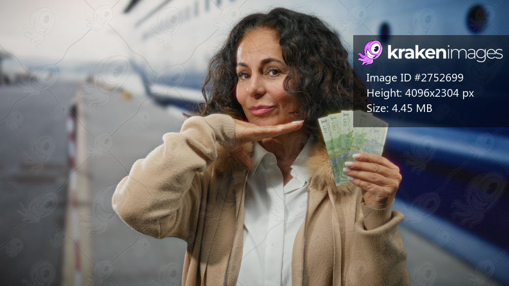 Middle-aged woman holding romanian banknotes at a seaside port with a boat in the background, capturing a relaxed outdoor atmosphere by the water.
