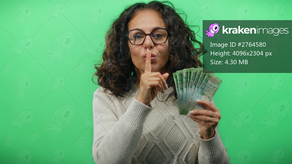Middle-aged woman holding russian ruble banknotes signals silence against a vibrant green background, creating a mysterious financial scene.