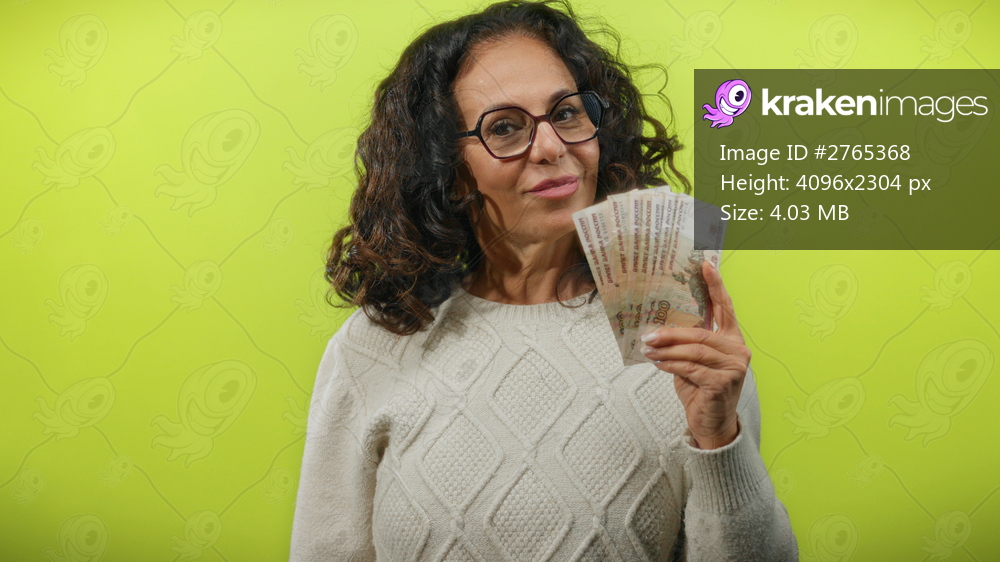 Middle-aged woman holding russian rubles in front of a plain yellow wall, showcasing currency and wealth with a confident expression in a bright isolated setting. - Kraken Images