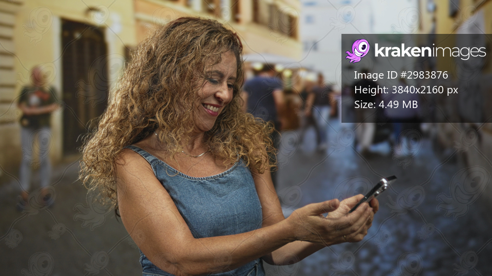 Middle aged woman holding smartphone with both hands and smiling while looking at her phone on a cobblestone street; contentment travel leisure.
