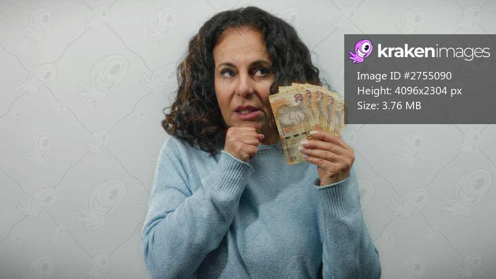 Middle-aged woman holding south african rand banknotes with a thoughtful expression against an isolated white background.