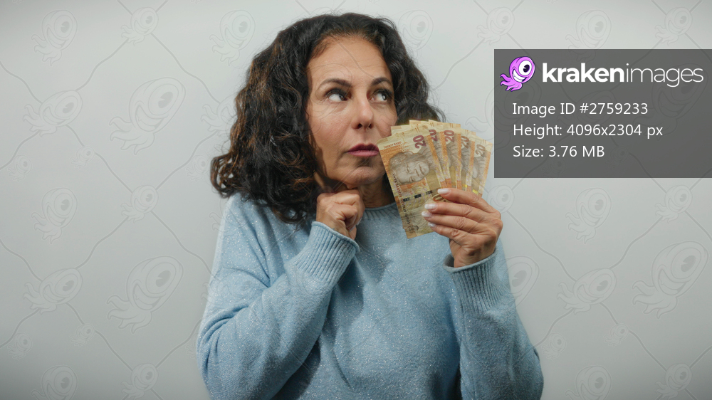 Middle-aged woman holding south african rand banknotes with a thoughtful expression against an isolated white background.