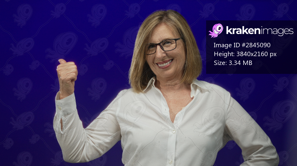Middle aged woman holding thumb up against a deep blue backdrop in a professional studio setting; confidence empowerment success growth.