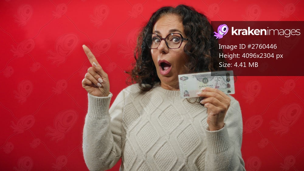 Middle-aged woman holding uae dirham banknote, surprised expression, red background, wearing glasses and sweater, signifying money decisions.