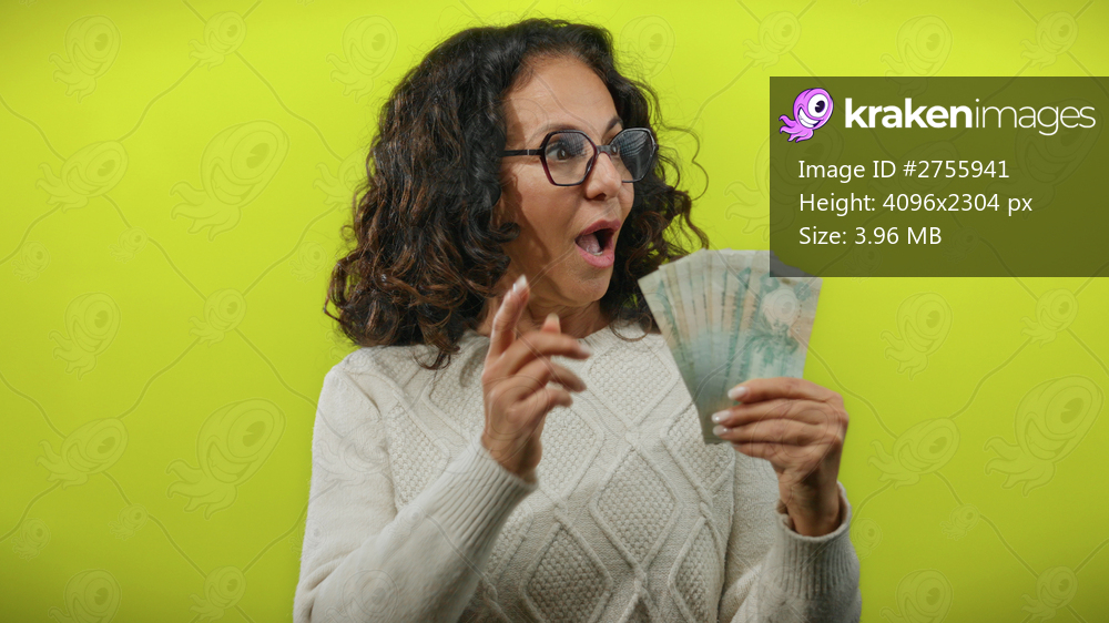 Middle-aged woman holding uae dirhams with a surprised expression against a vibrant yellow background.