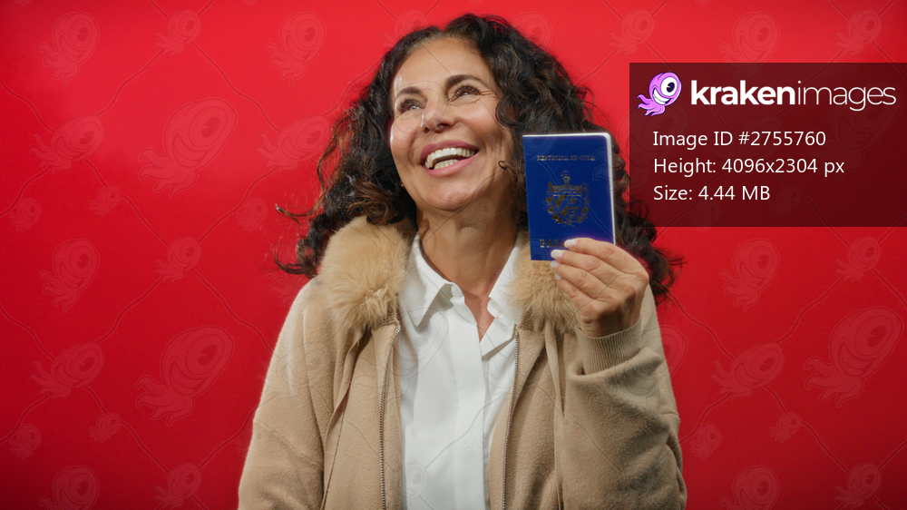 Middle-aged woman holds a cuban passport against red background, showcasing travel and identity with a joyful expression.