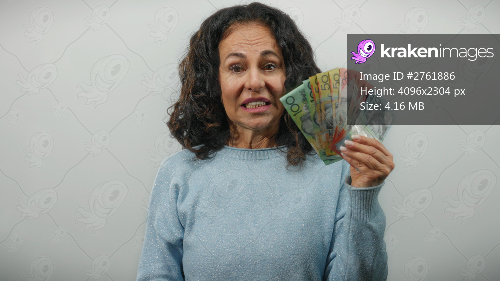 Middle-aged woman holds australian dollars nervously against a white wall background, capturing an emotional moment of financial concern and uncertainty. - Kraken Images