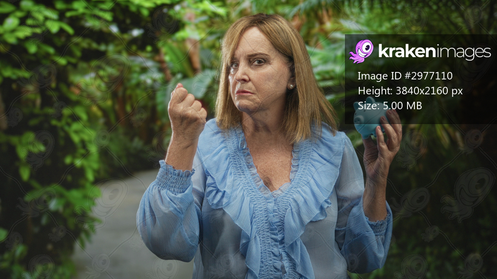Middle aged woman holds blue piggy bank and clenches fist on forest path; frugality determination saving.