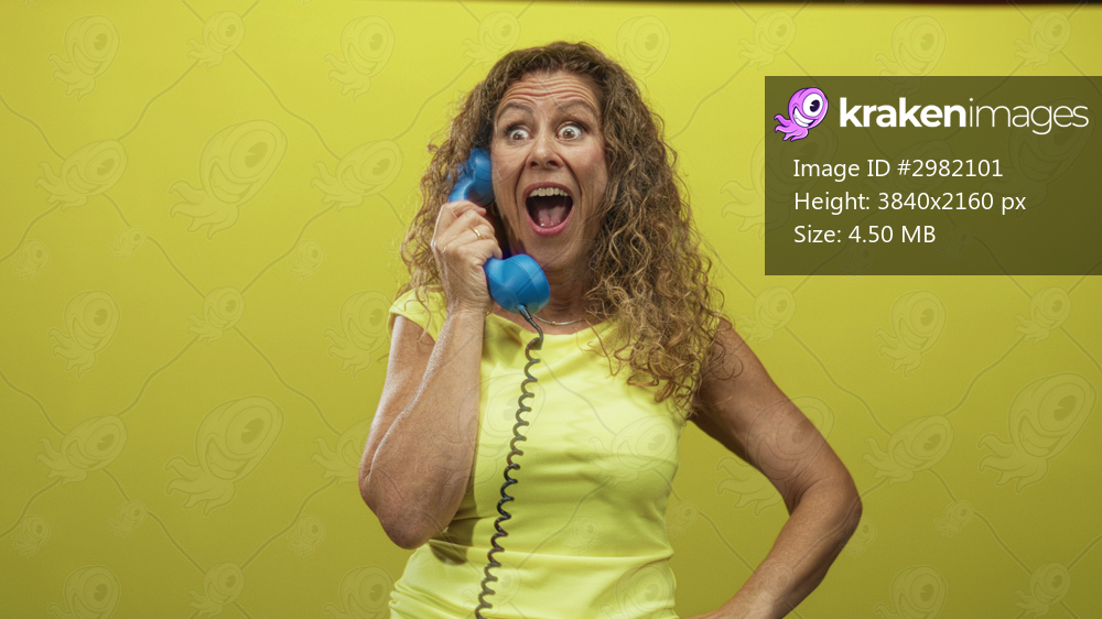 Middle-aged woman holds blue telephone to ear, mouth open with hand on hip against bright yellow studio wall; surprise delight.