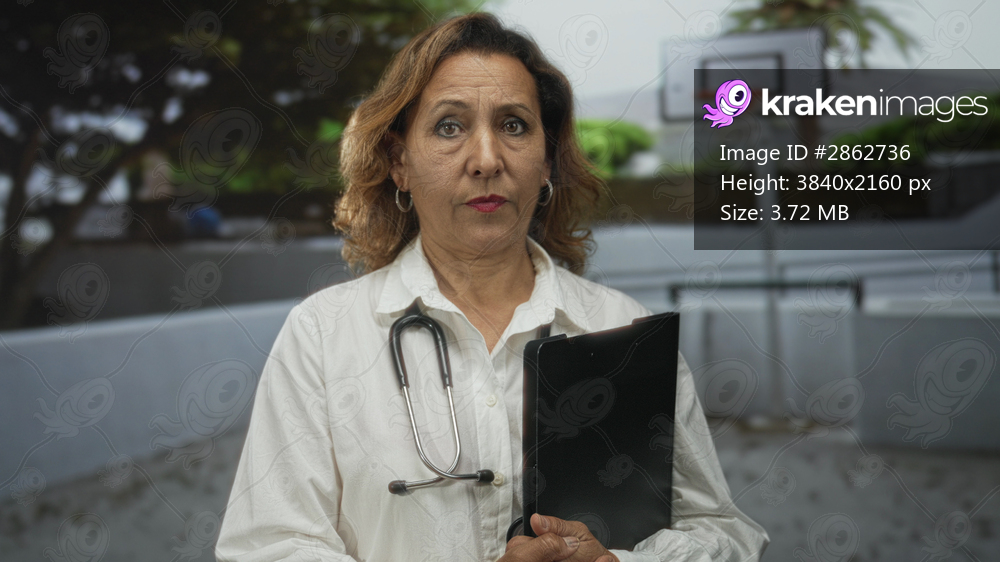 Middle aged woman holds clipboard with stethoscope on neck near basketball hoop in building; dedication.