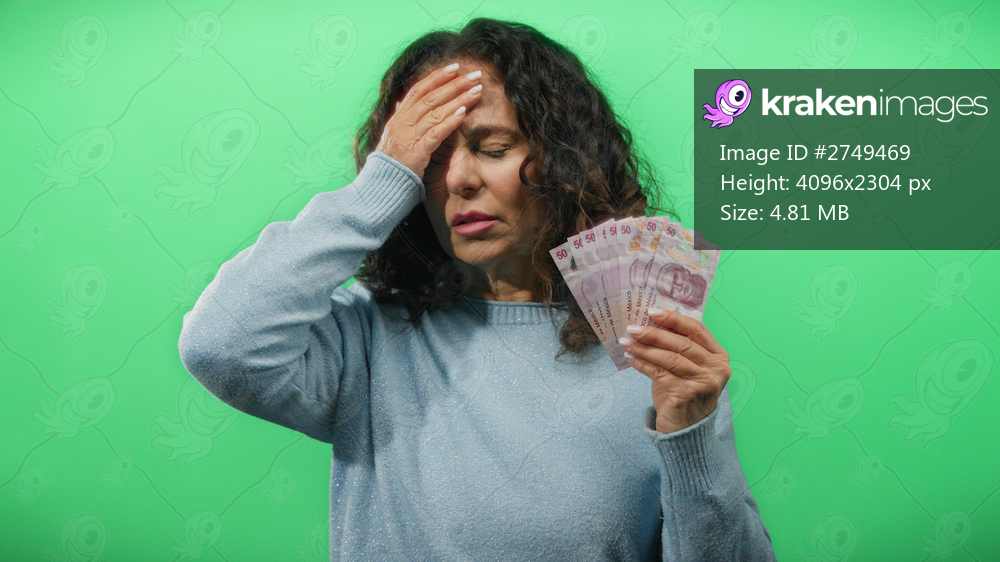 Middle-aged woman holds mexican pesos with a stressed expression against a green background wall, depicting financial concern and currency handling.