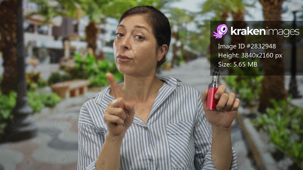 Middle aged woman holds and points finger to red vaporizer in park walkway under palm trees; safety warning.