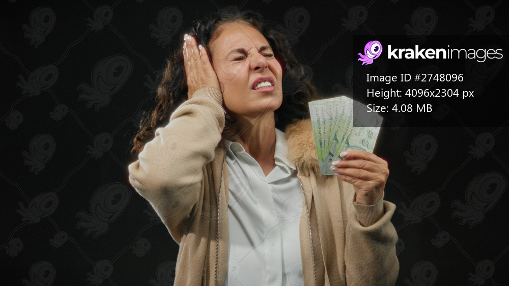 Middle-aged woman holds singapore dollars against noise in a black background, conveying stress with money.