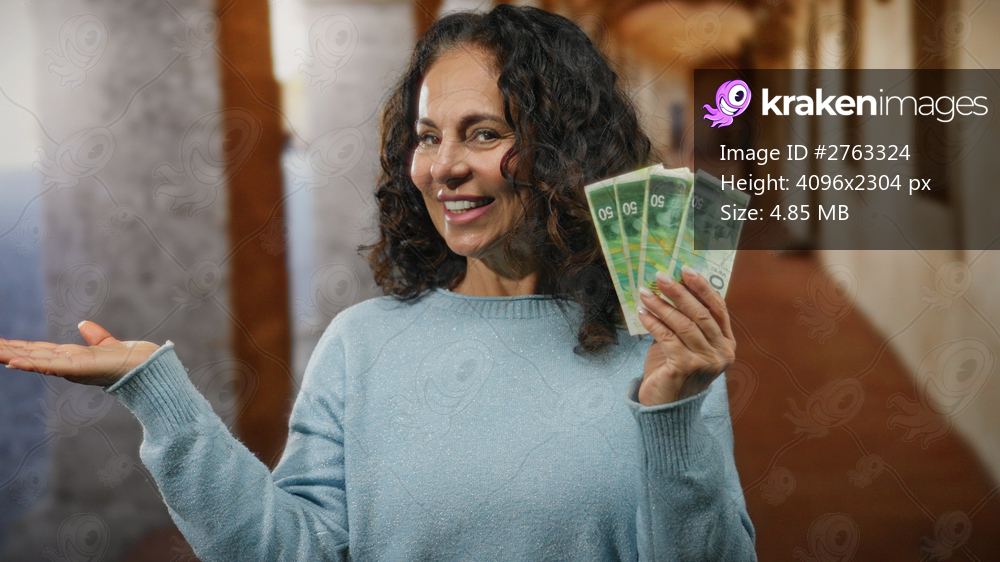 Middle-aged woman in a blue sweater outdoors at a university, holds israeli shekels, smiling with an open hand.