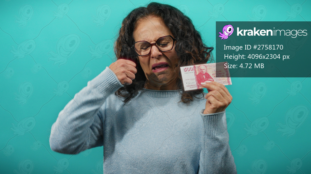 Middle-aged woman in blue sweater on turquoise background holding icelandic krona banknotes with a sad expression reflecting financial distress.