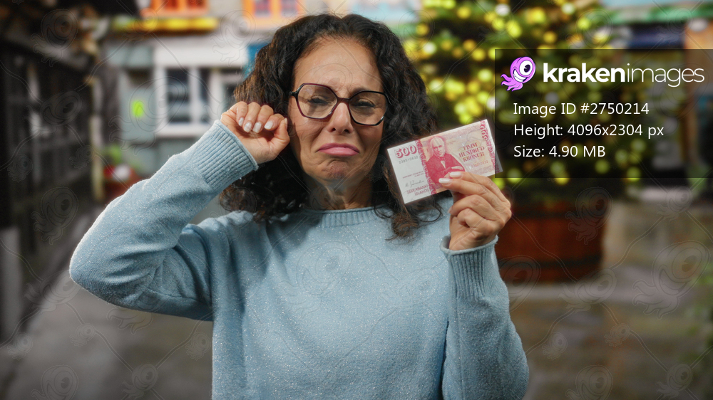 Middle-aged woman in city street holding icelandic krona banknote, depicting emotions with glasses and blue sweater.