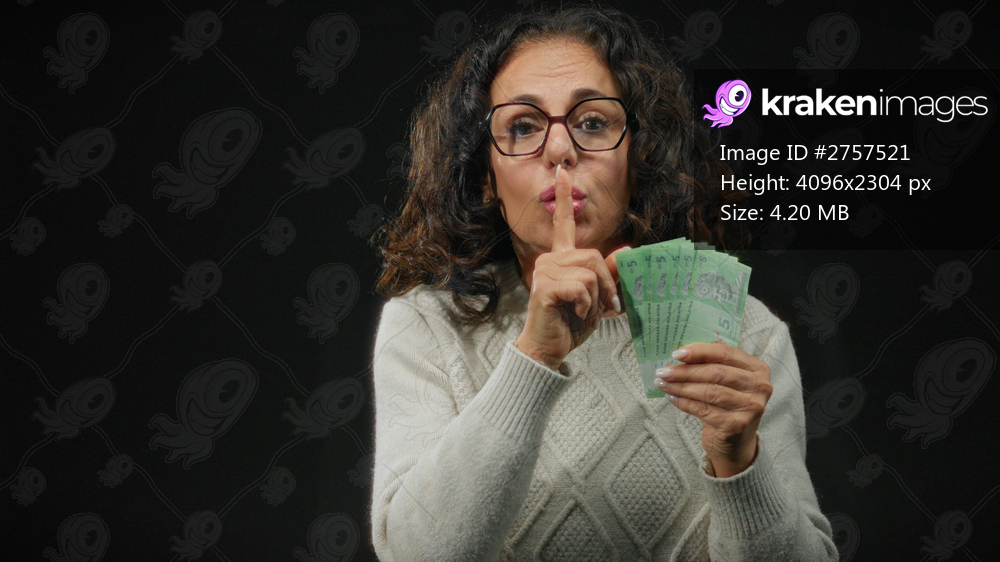 Middle-aged woman in glasses holding malaysian ringgit banknotes with a gesture for silence against black background, conveying secrecy and finance concepts. - Kraken Images